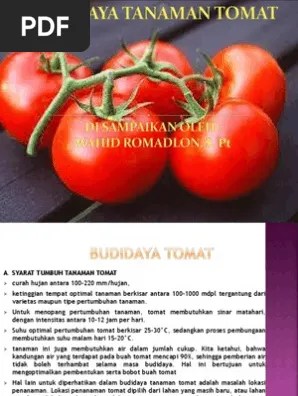 Teknik budidaya tanaman tomat cherry (lycopersicum. Budidaya tanaman tomat (lycopersicon escelentum mill) secara umum dilakukan: Budidaya tomat di dataran rendah telah diterapkan dengan baik mulai dari persemaian hingga panen dan pemasaran. Yang dipersiapkan dan disusun oleh : Tomat adalah tanaman semak semusim yang ditanam dalam skala besar oleh petani di indonesia.